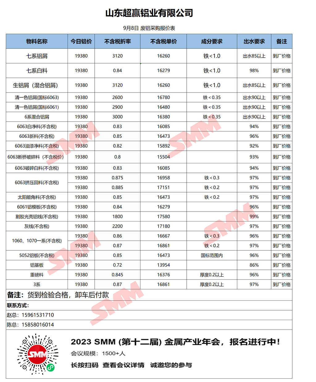 9月8日超赢铝业 废铝采购报价