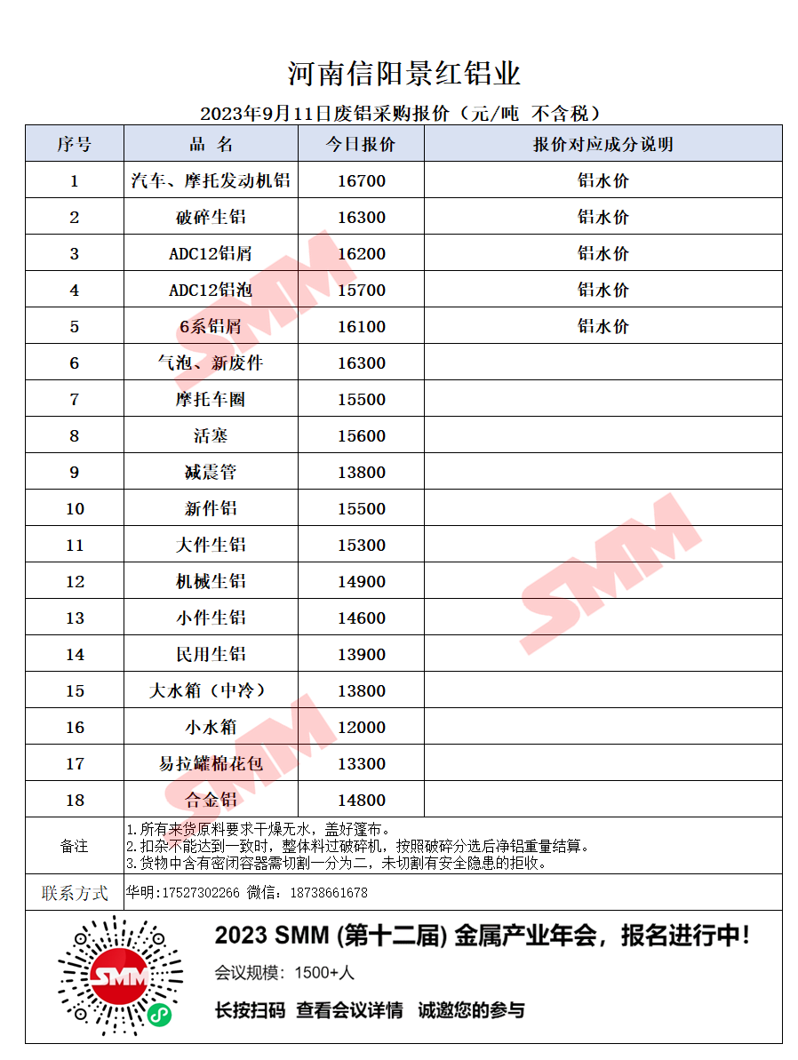 今日河南信阳景红铝业 废铝采购报价已更新,有货的朋友欢迎联系我们!