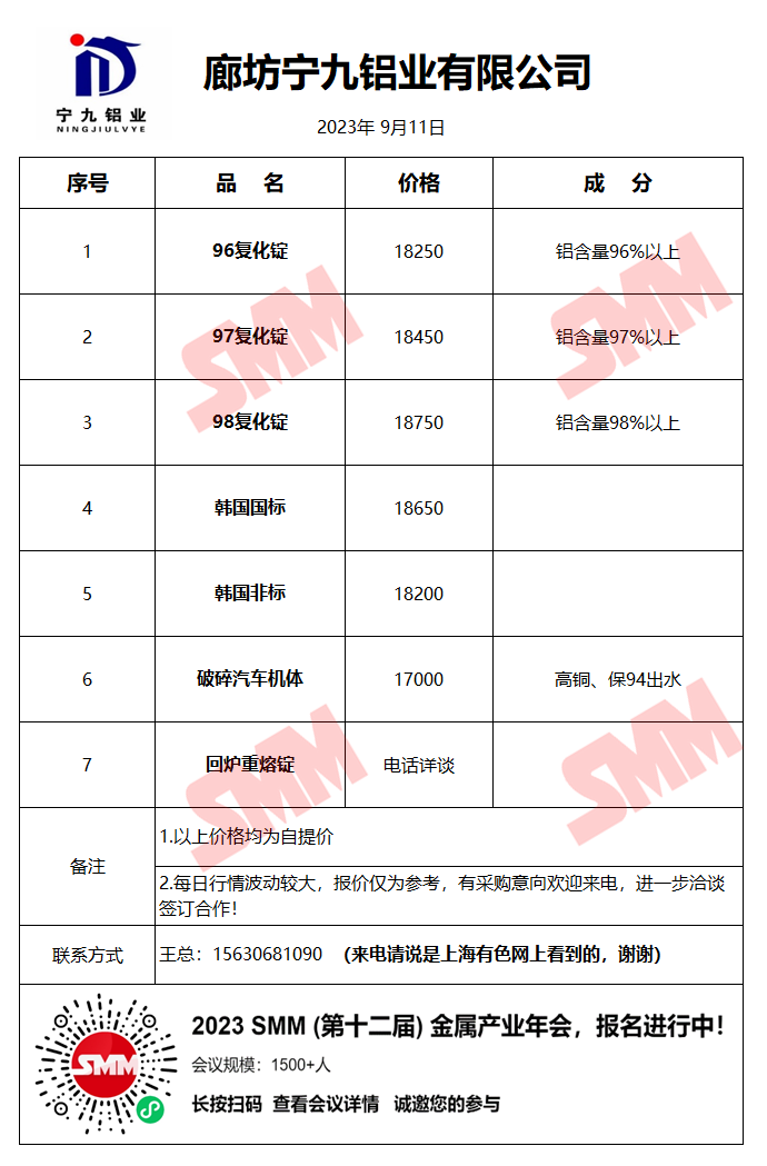 9月11日宁九铝业 废铝销售报价