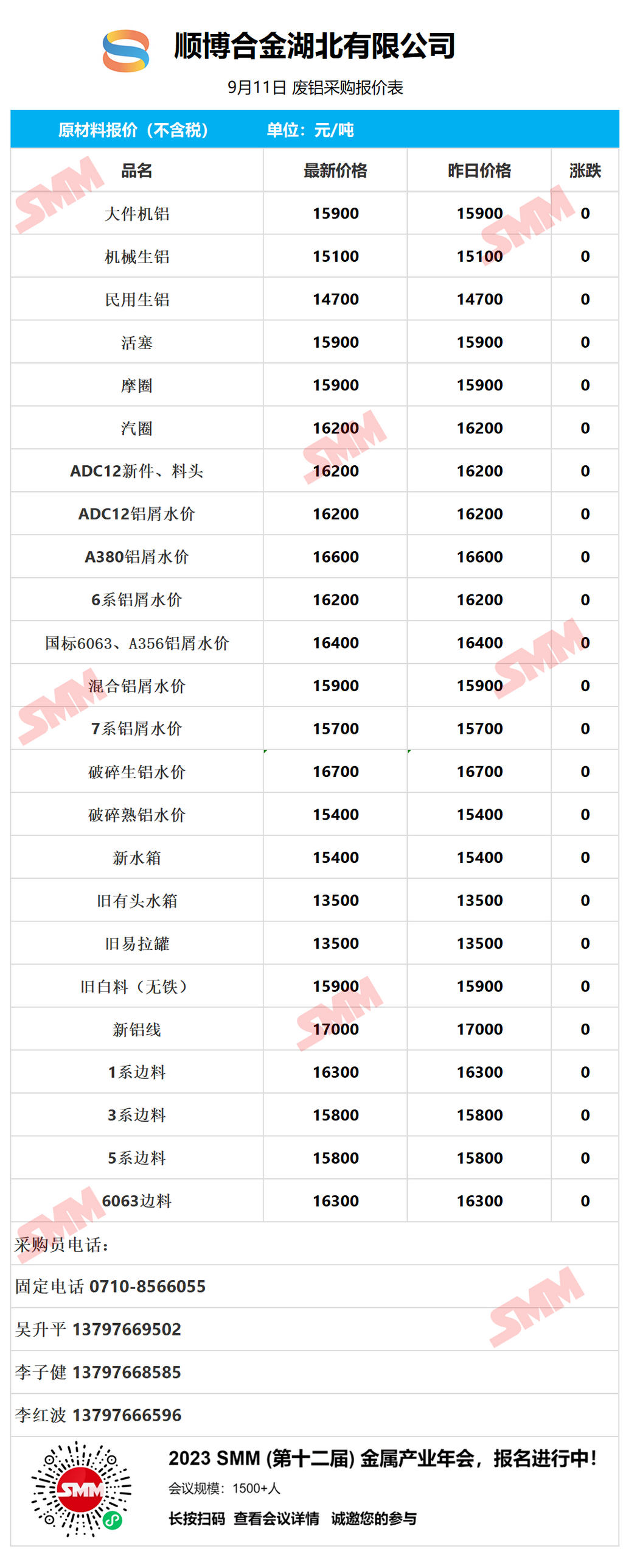 今日顺博合金湖北废铝采购报价已更新,有货的朋友欢迎联系我们!