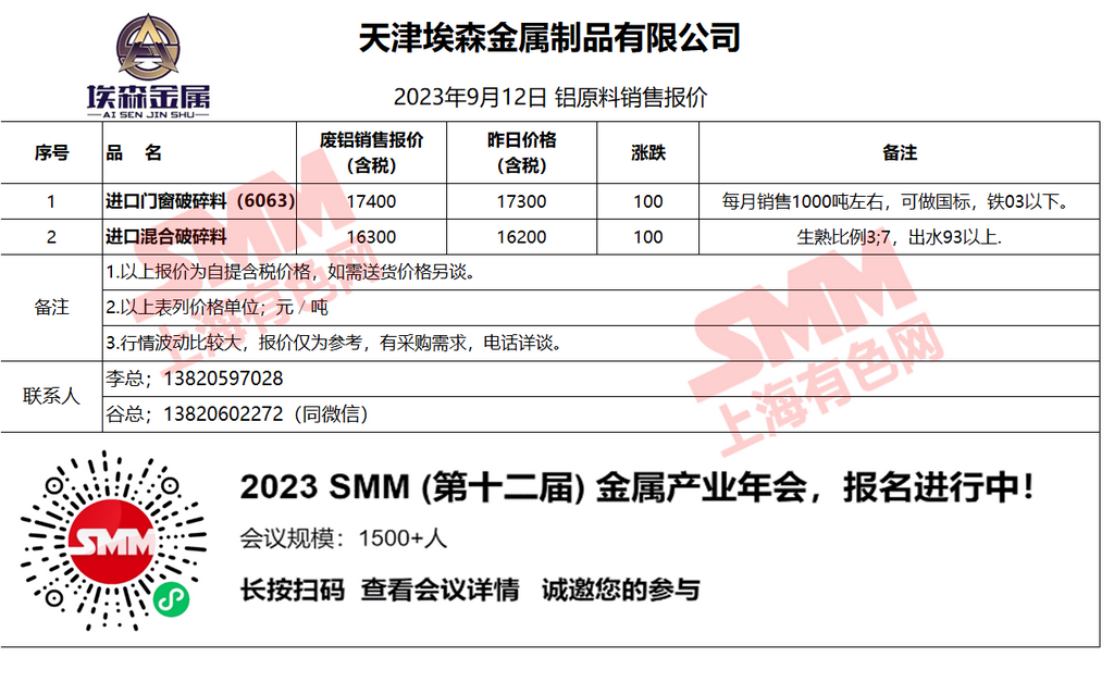 9月12日天津埃森 废铝销售报价