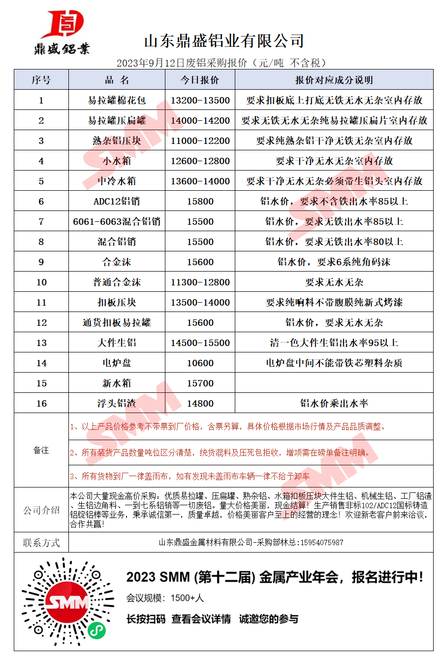 今日山东鼎盛铝业 废铝采购报价已更新,有货的朋友欢迎联系我们!