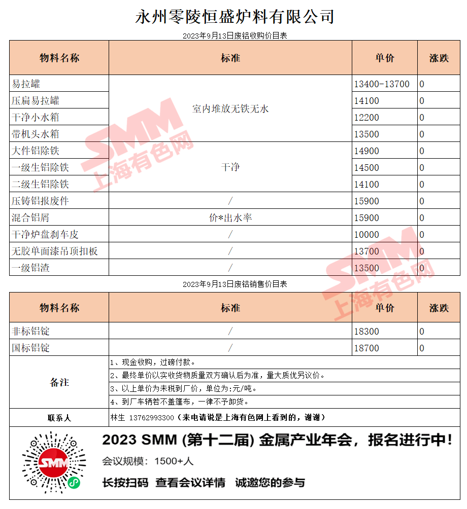 9月13日湖南恒盛 废铝收购报价