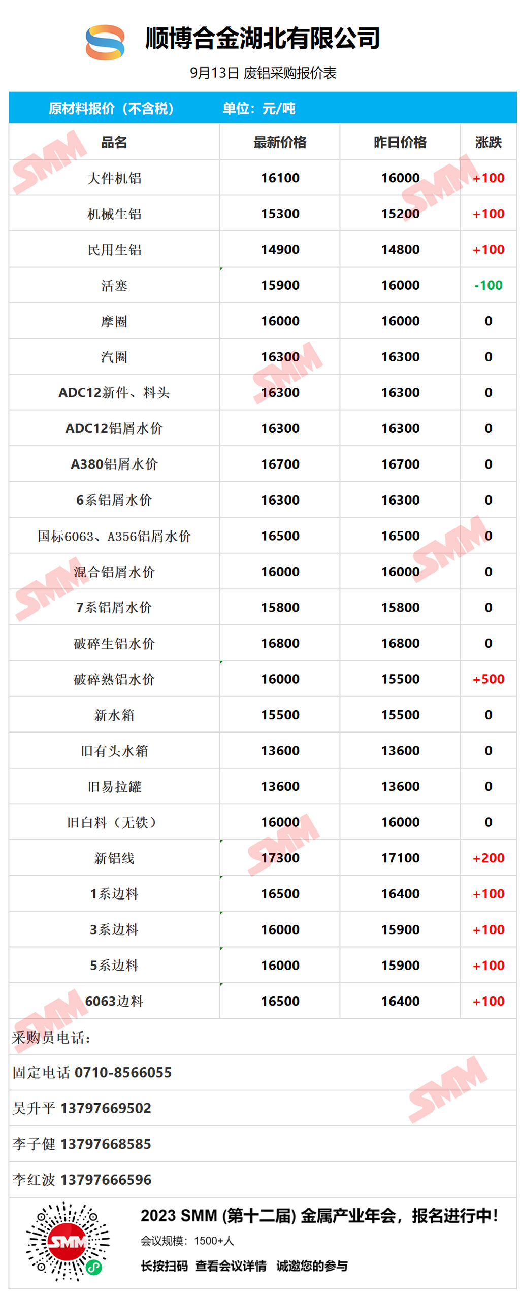 今日顺博合金湖北废铝采购报价已更新,有货的朋友欢迎联系我们!