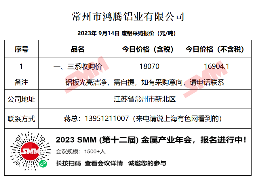 9月14日鸿腾铝业 废铝采购报价