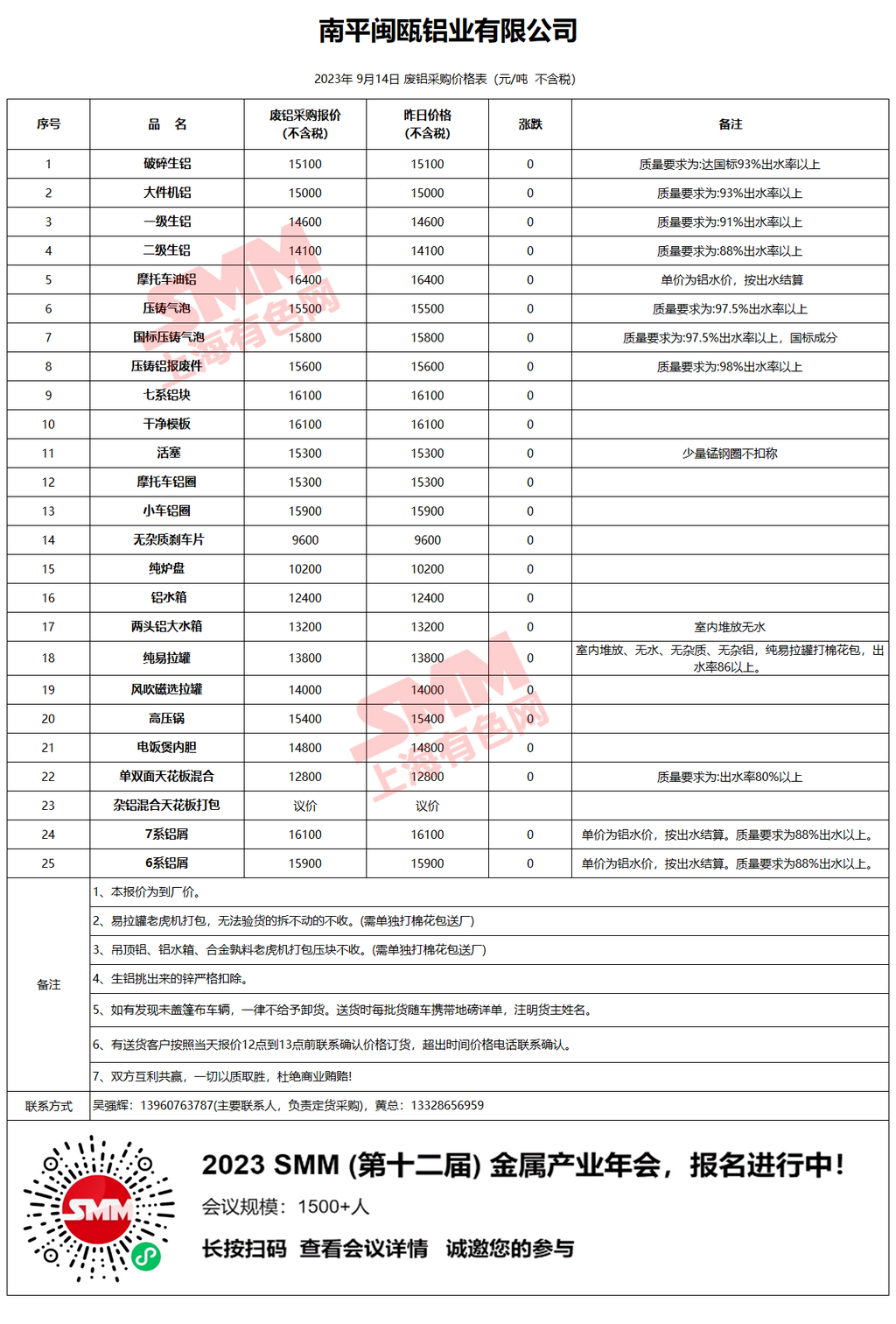 9月14日南平闽瓯 废铝采购报价