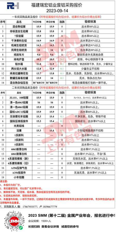 今日福建瑞宏 废铝采购报价已更新,有货的朋友欢迎联系我们!