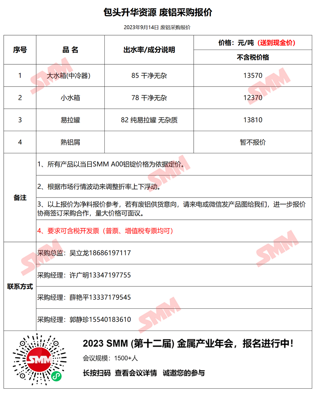 9月14日包头升华 废铝采购报价