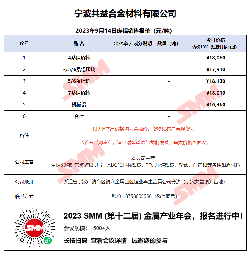 今日宁波共益,废铝销售报价已更新,有采购需求的朋友,欢迎联系我们!