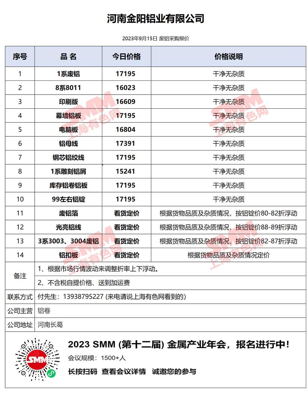 今日河南金阳铝业有限公司 废铝采购报价已更新,有货的朋友欢迎联系我们!