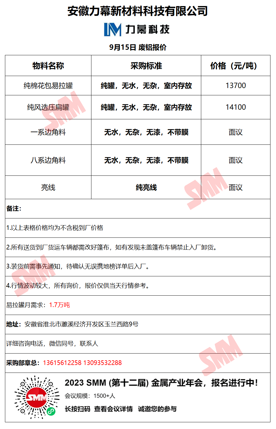 9月15日安徽力幕 废铝采购报价