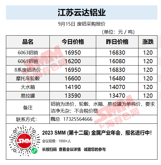 9月15日江苏云达铝业 废铝采购报价