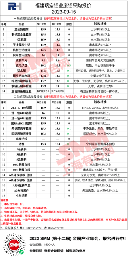 9月15日福建瑞宏 废铝采购报价