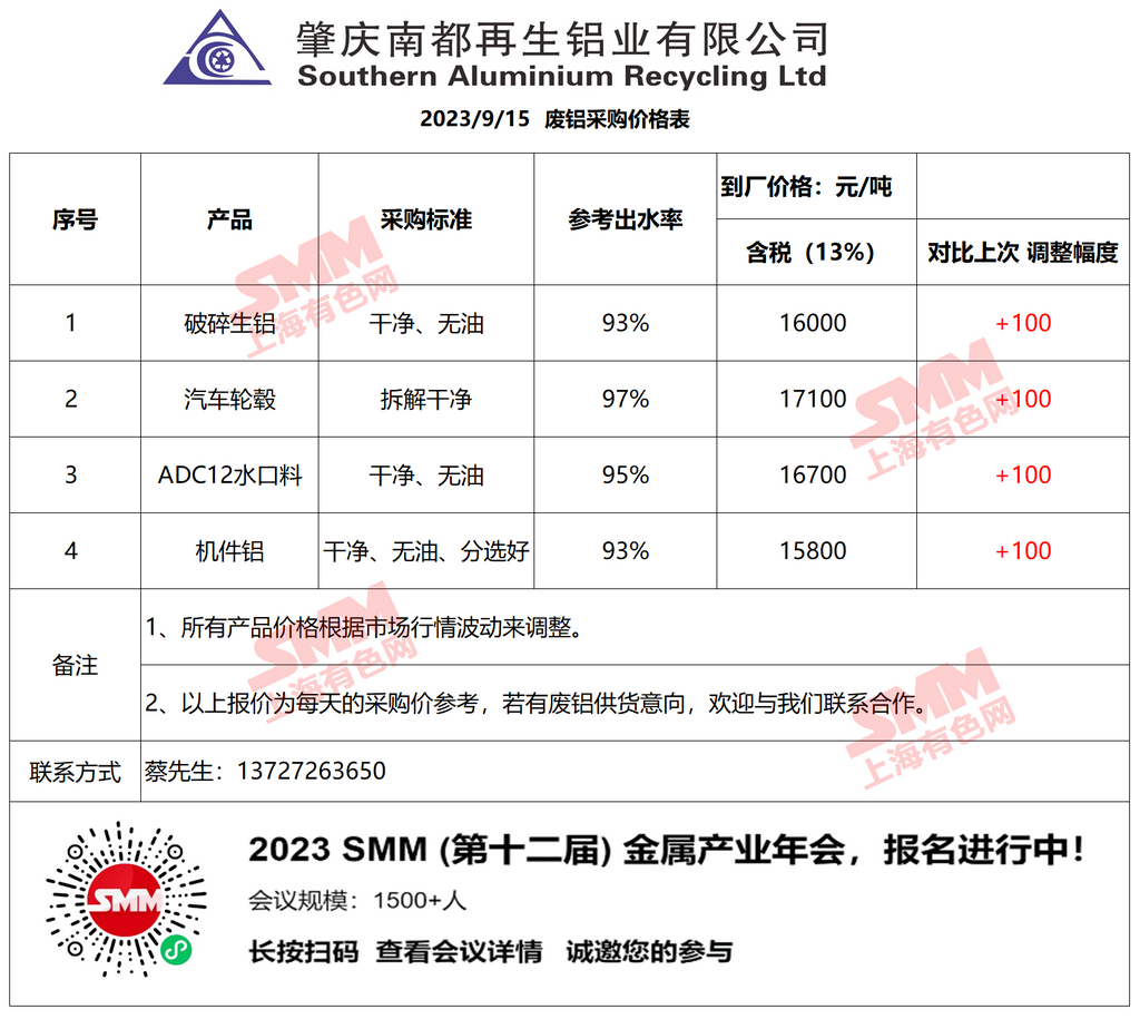 9月15日南都再生铝业 废铝采购报价