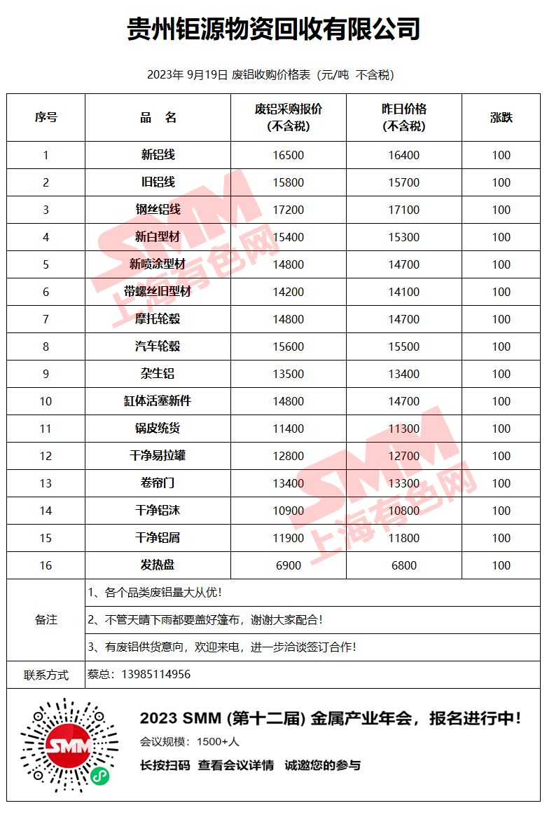 9月19日贵州钜源 废铝收购报价
