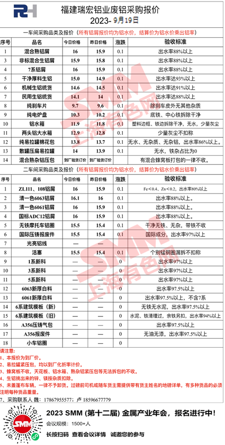 9月19日福建瑞宏 废铝采购报价