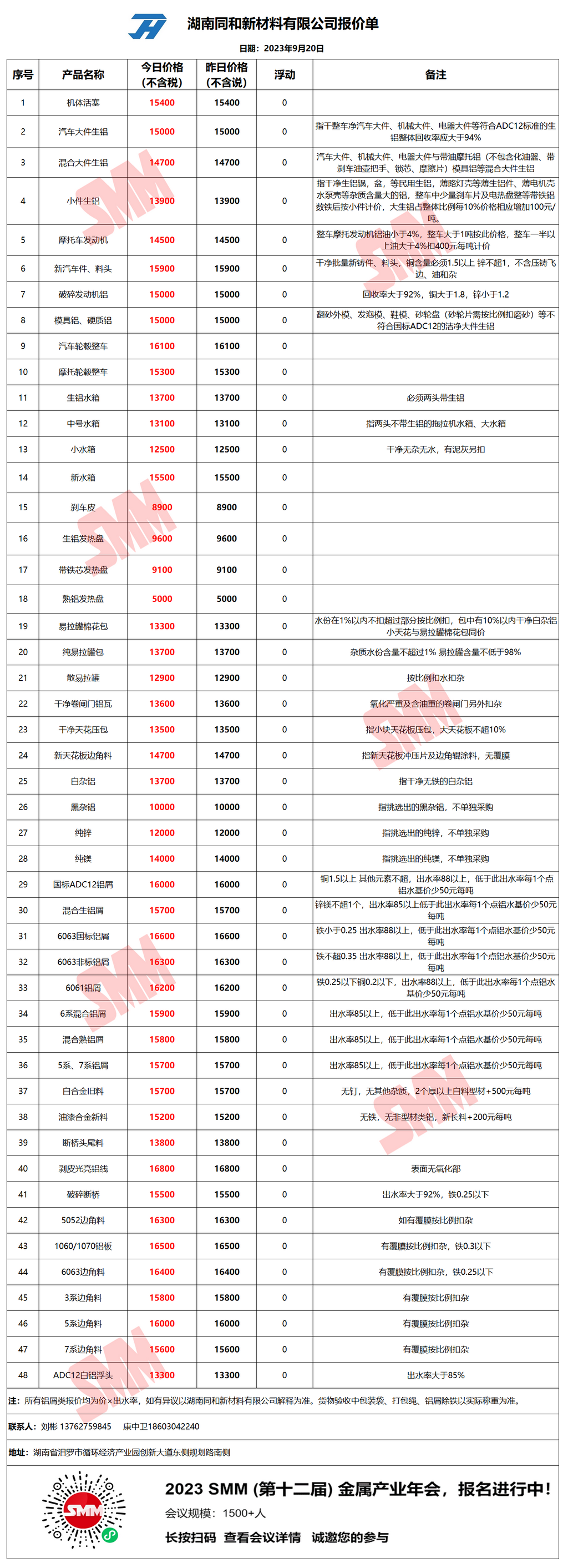 9月20日湖南同和 废铝采购报价