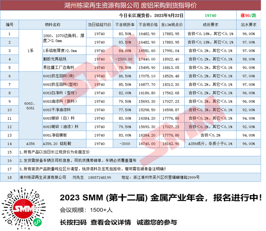 9月22日湖州栋梁再生 废铝采购报价