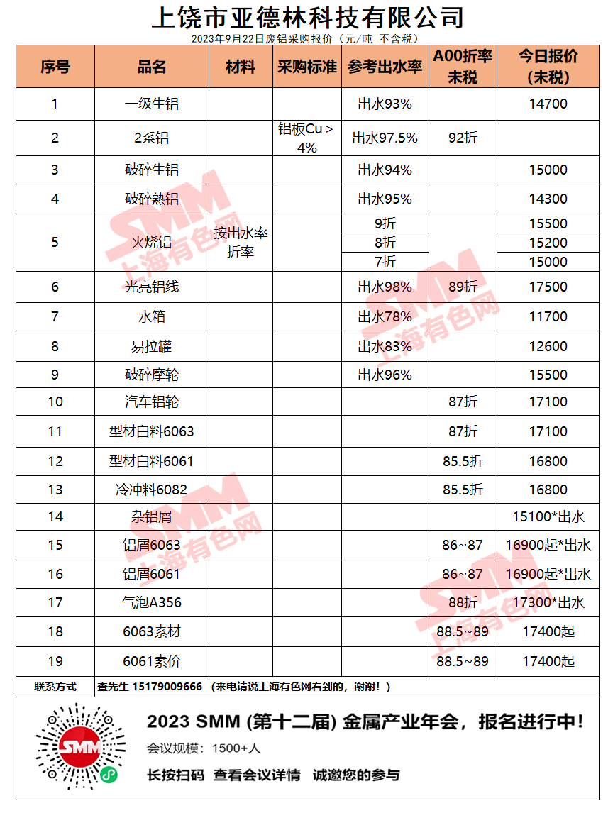 9月22日上饶市亚德林 废铝采购报价