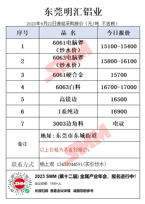 9月22日东莞明汇铝业 废铝采购报价