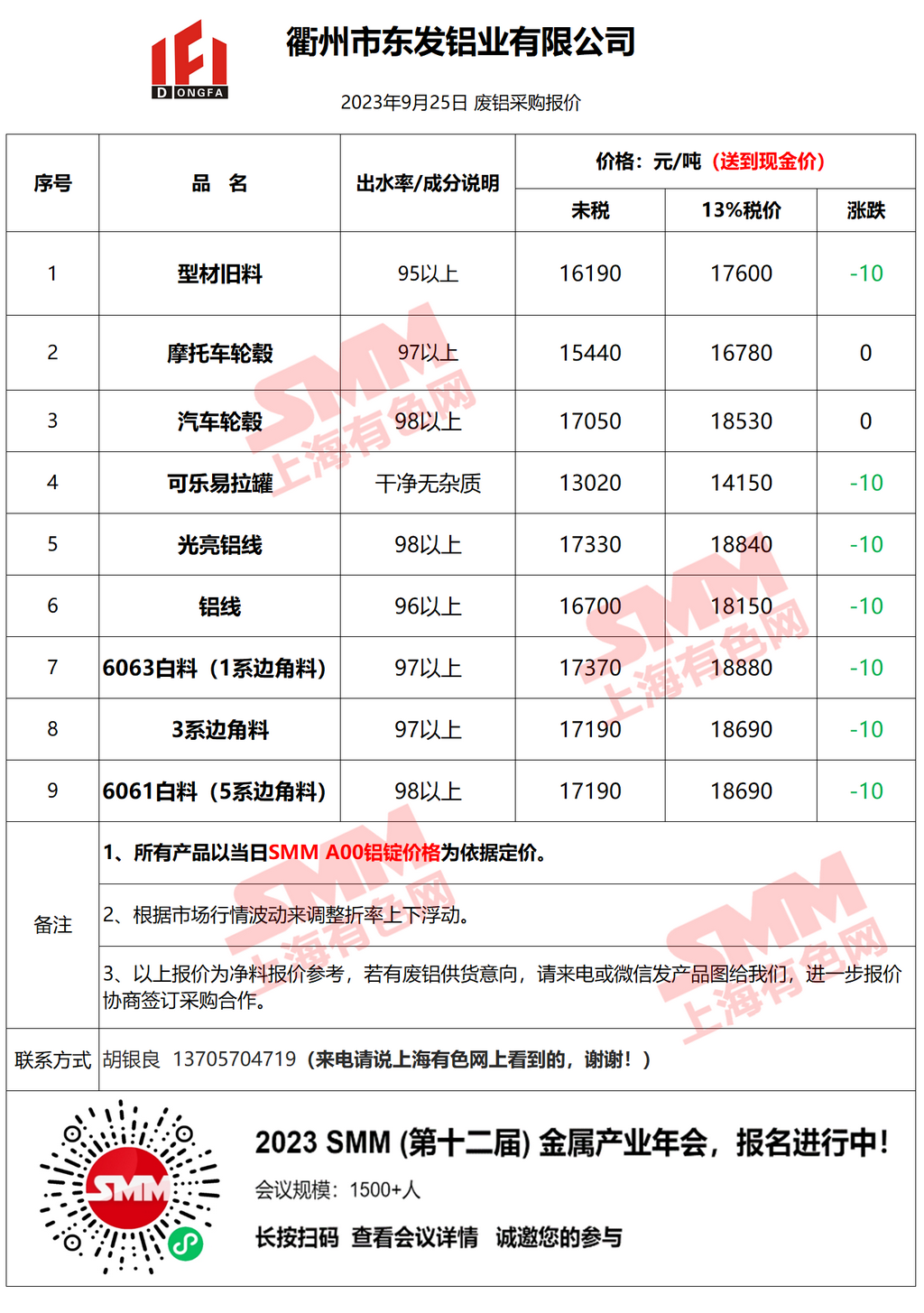 今日衢州东发 废铝采购报价已更新,有货的朋友欢迎联系我们!