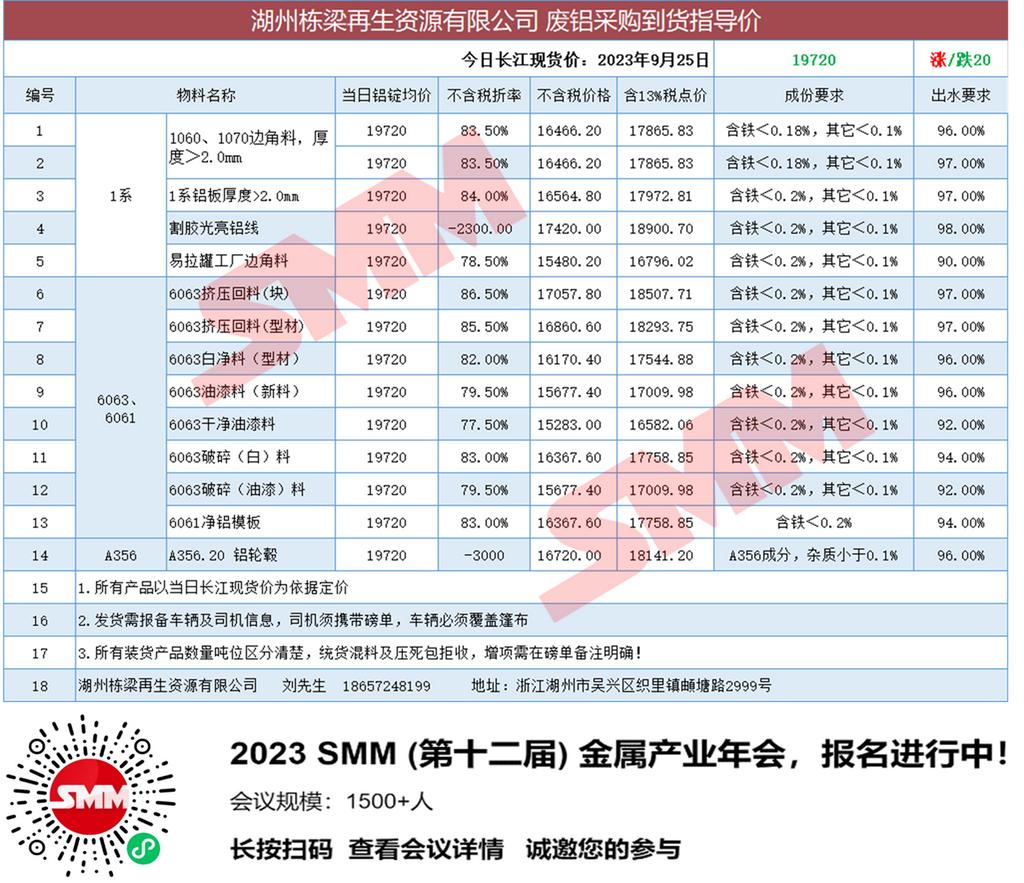 9月25日湖州栋梁再生 废铝采购报价