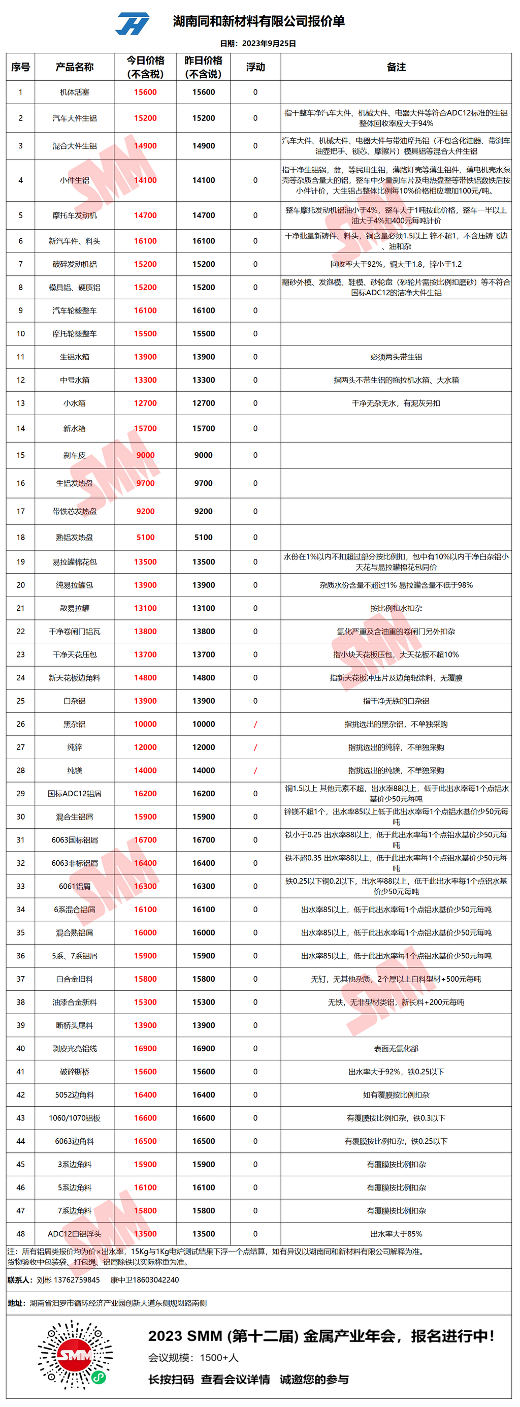 9月25日湖南同和 废铝采购报价
