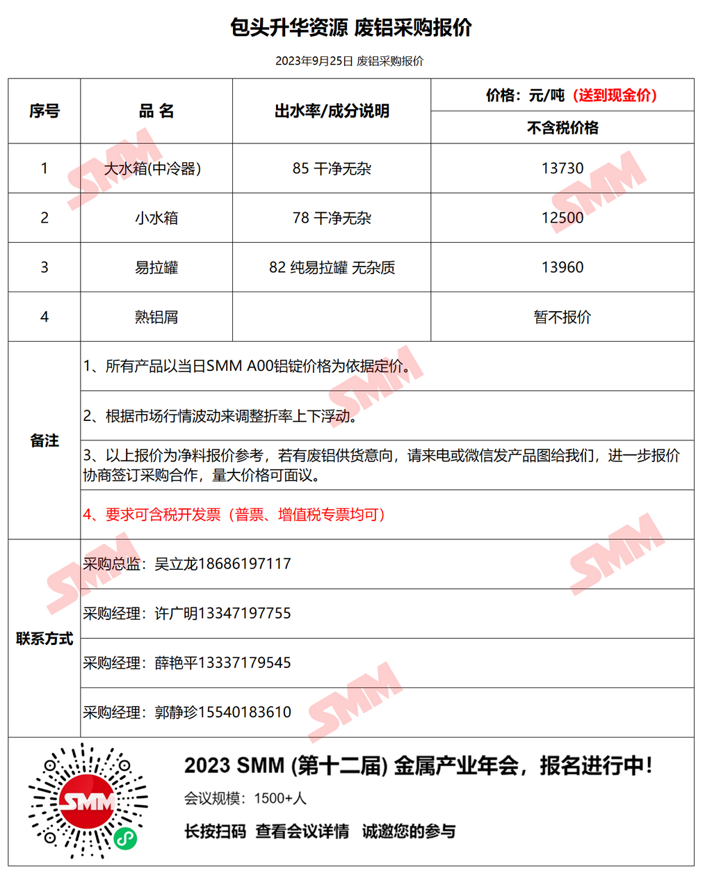 9月25日包头升华 废铝采购报价