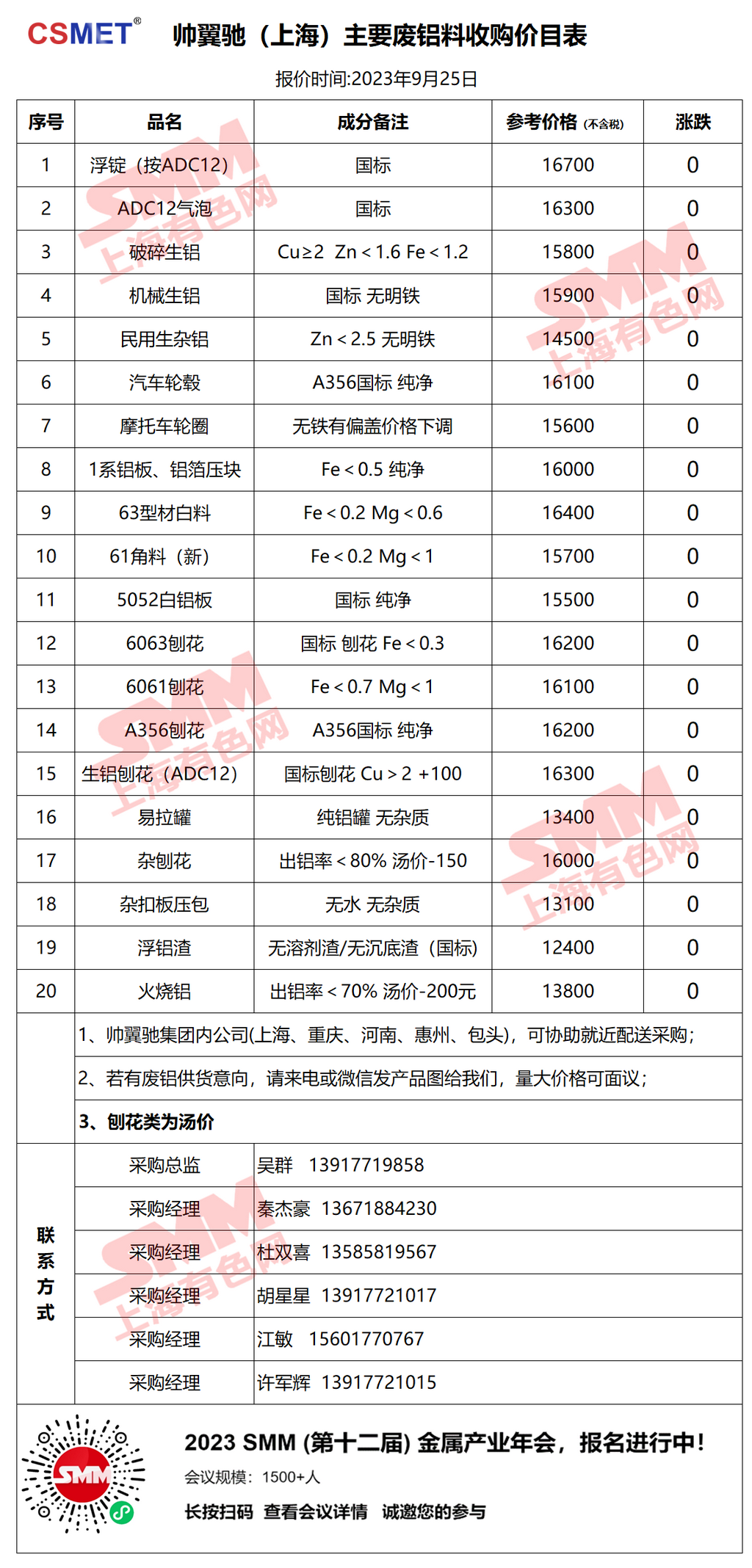 9月25日帅翼驰(上海) 废铝采购报价