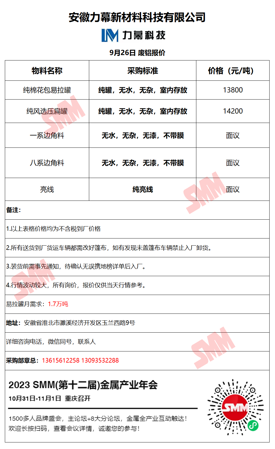 9月26日安徽力幕 废铝采购报价