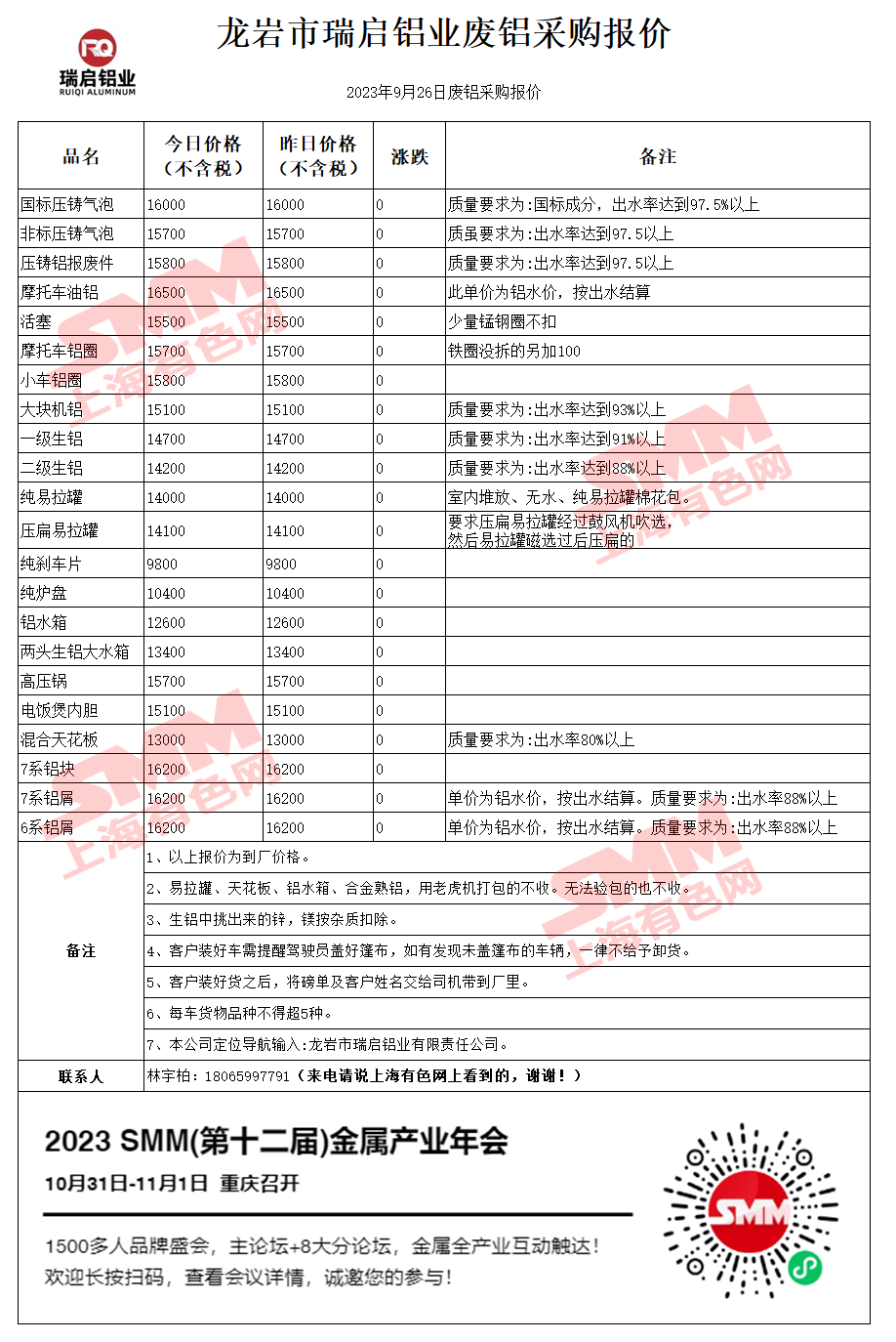 9月26日龙岩瑞启 废铝采购报价