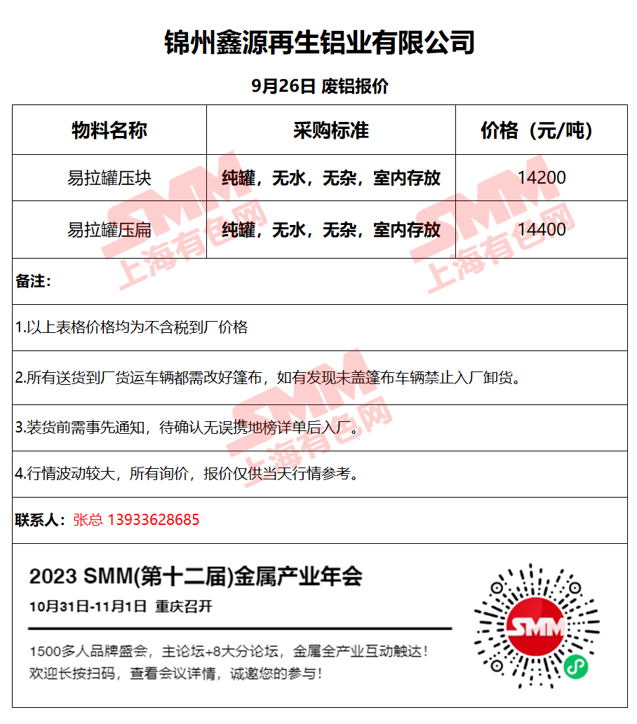 9月26日鑫源再生 废铝采购报价