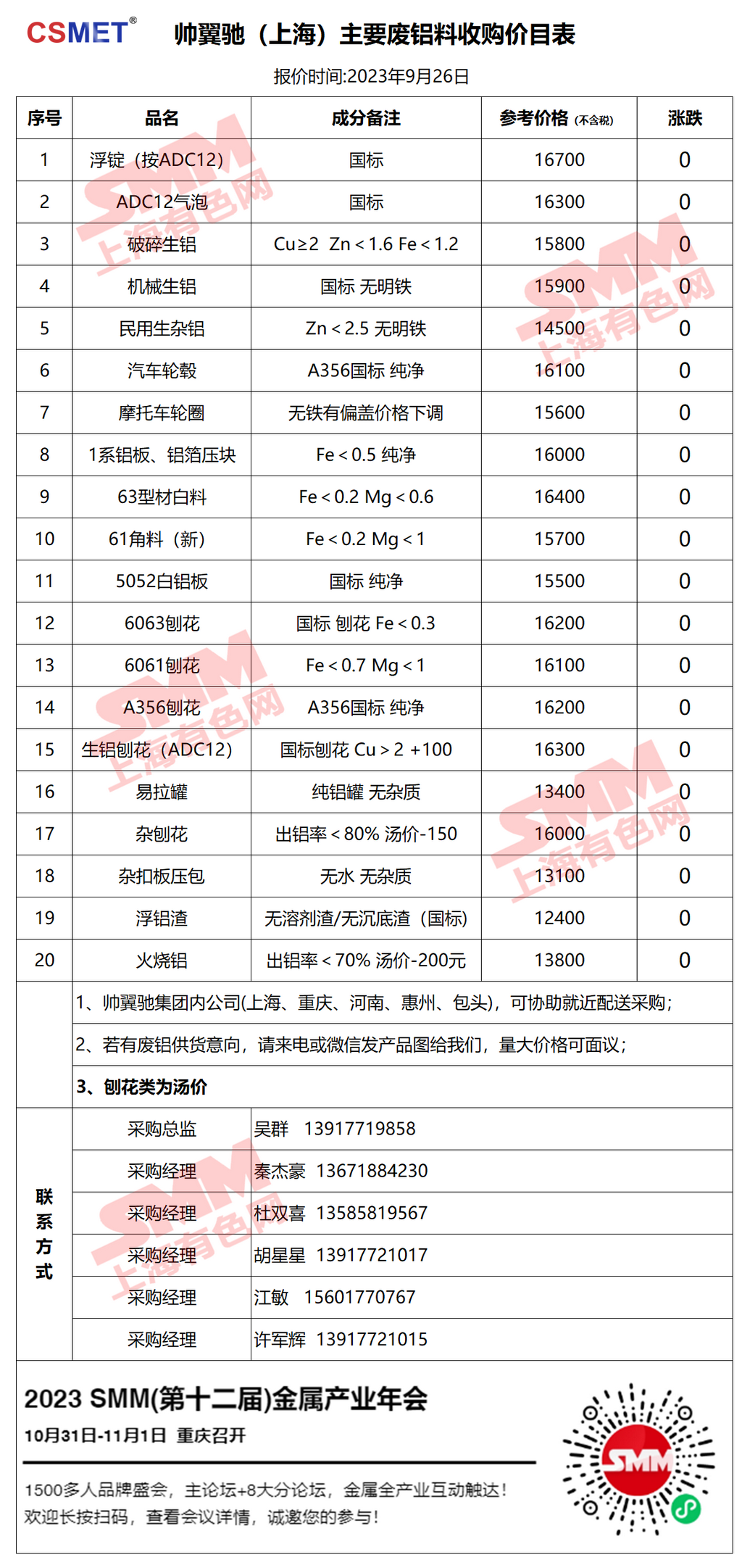 帅翼驰(上海)今日主要废铝料收购价目表已更新,有货的朋友欢迎联系我们!