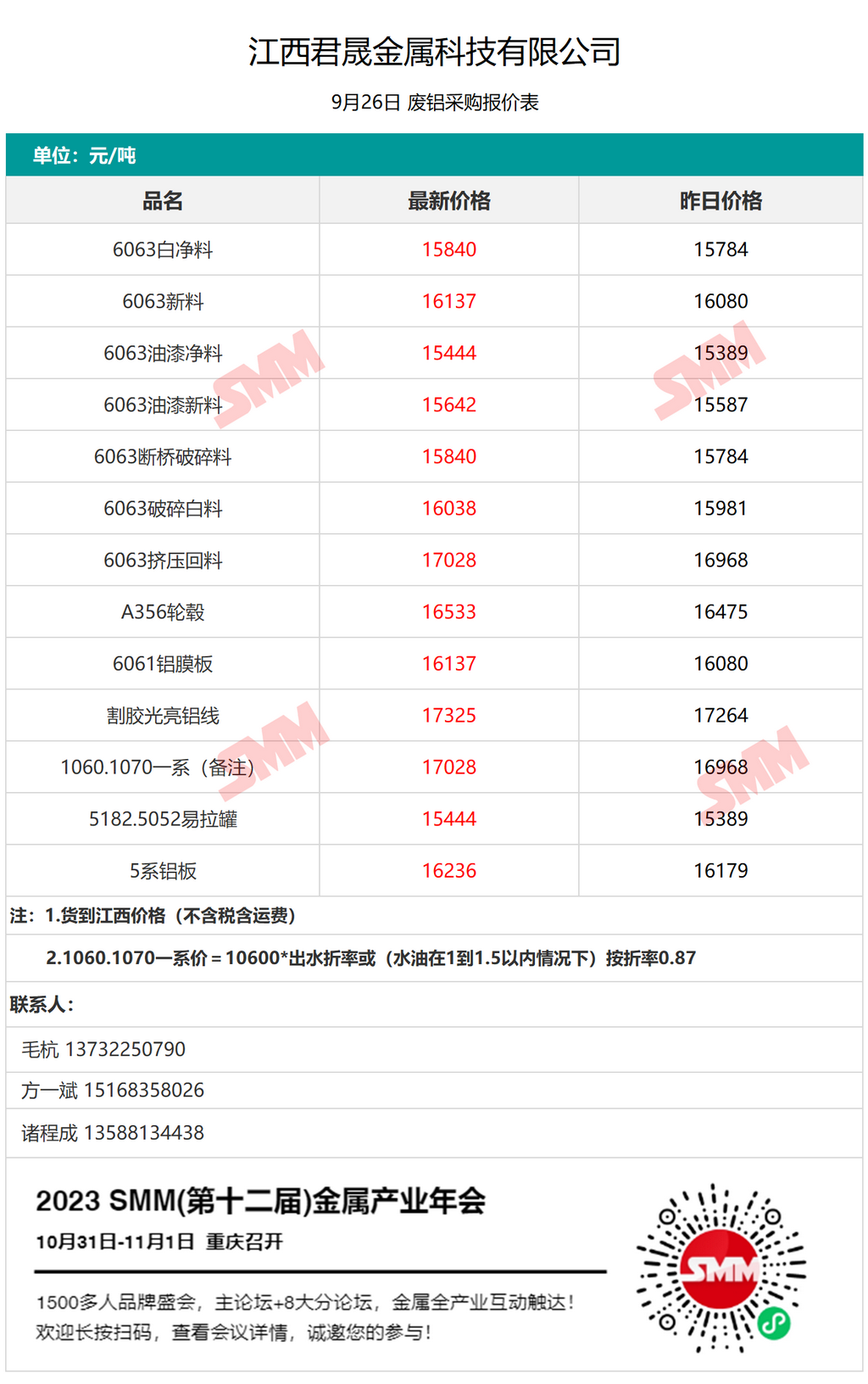 9月26日江西君晟金属 废铝采购报价