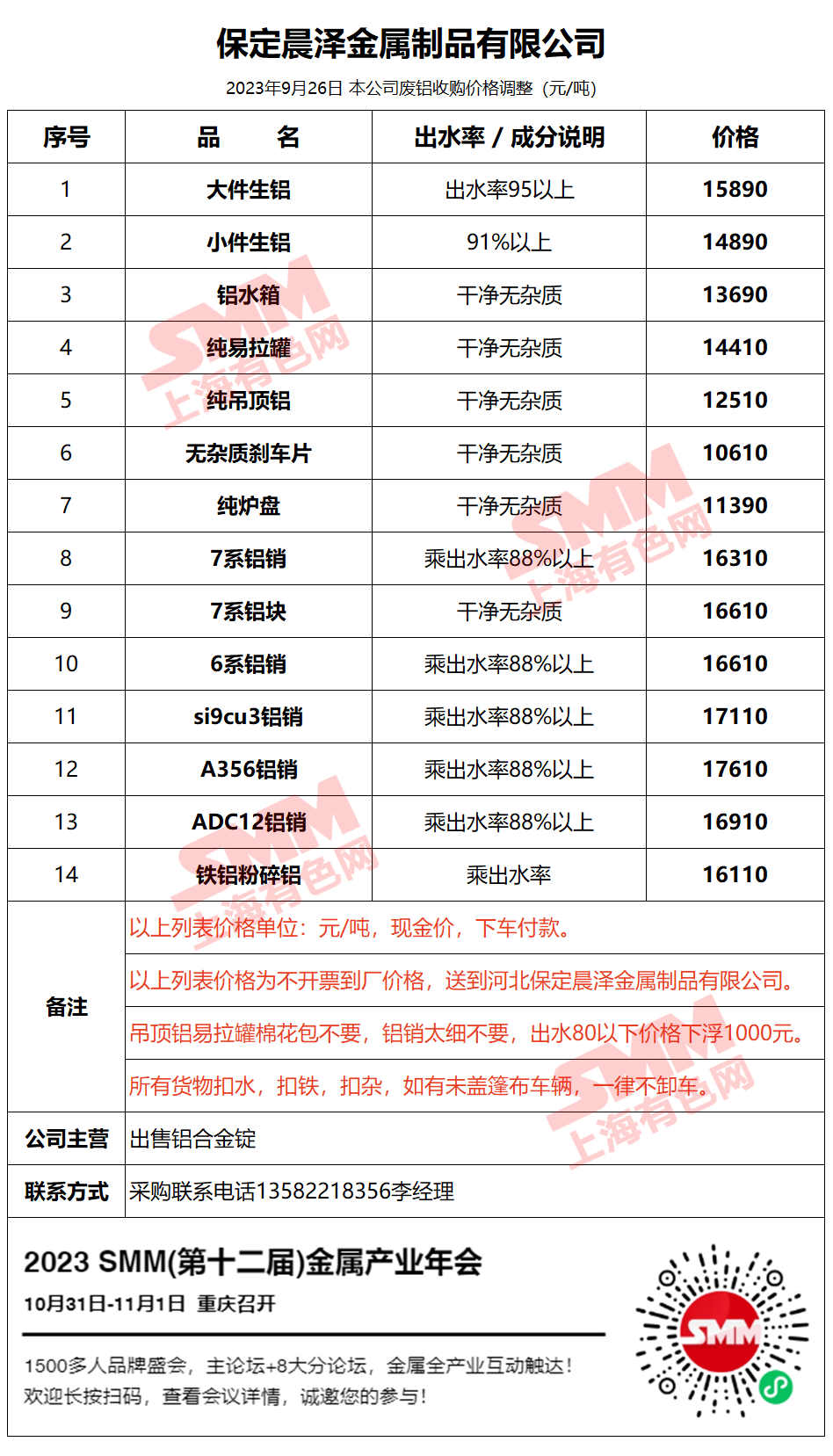 9月26日保定晨泽 废铝采购报价