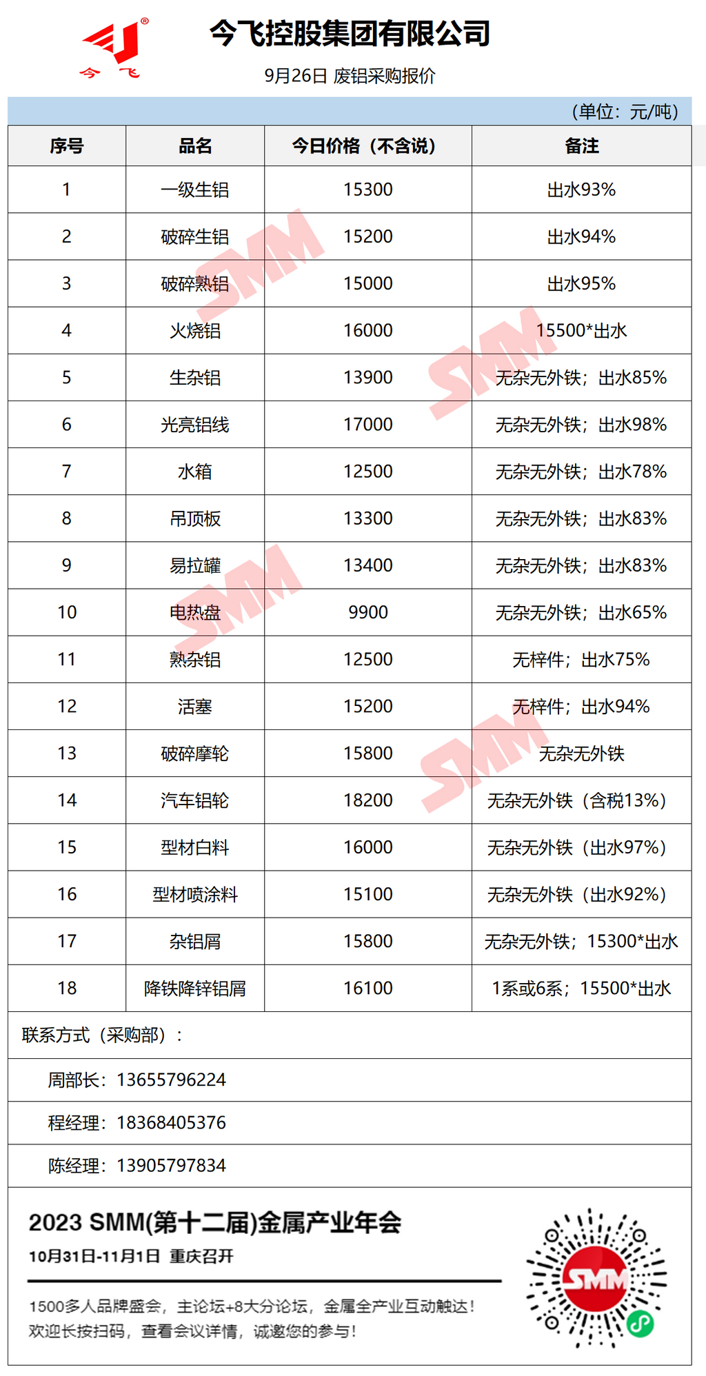 今日今飞集团 废铝采购报价已更新,有货的朋友欢迎联系我们!