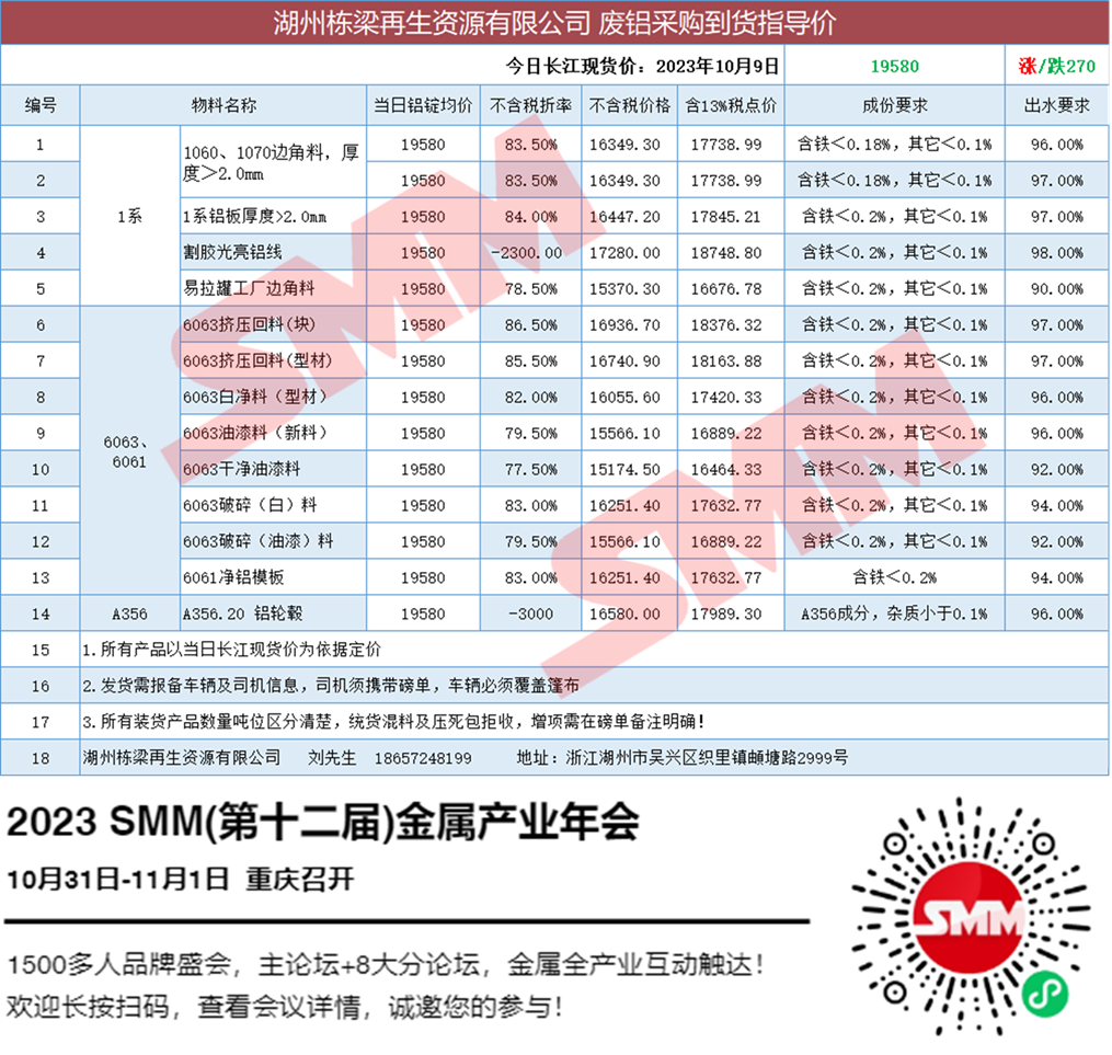 10月9日湖州栋梁再生 废铝采购报价
