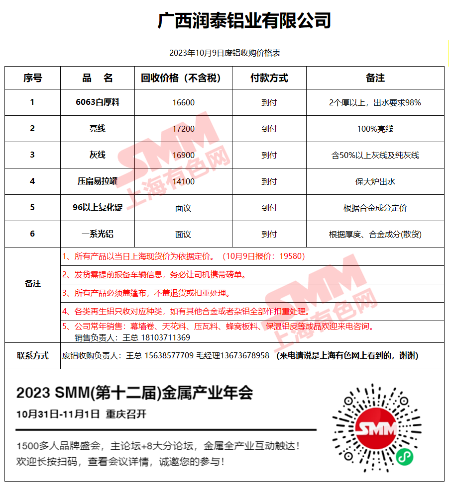 10月9日广西润泰铝业 废铝采购报价
