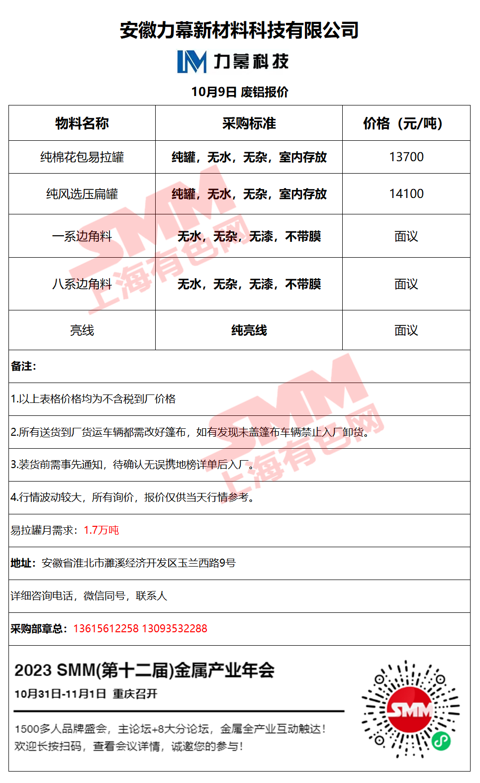 10月9日安徽力幕 废铝采购报价