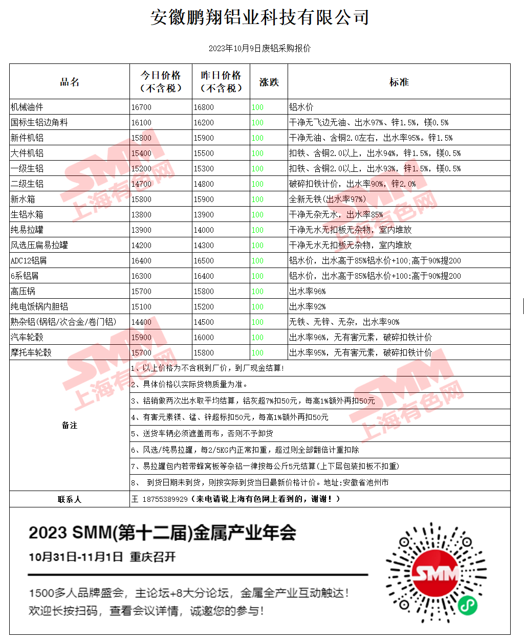 10月9日安徽鹏翔 废铝采购报价