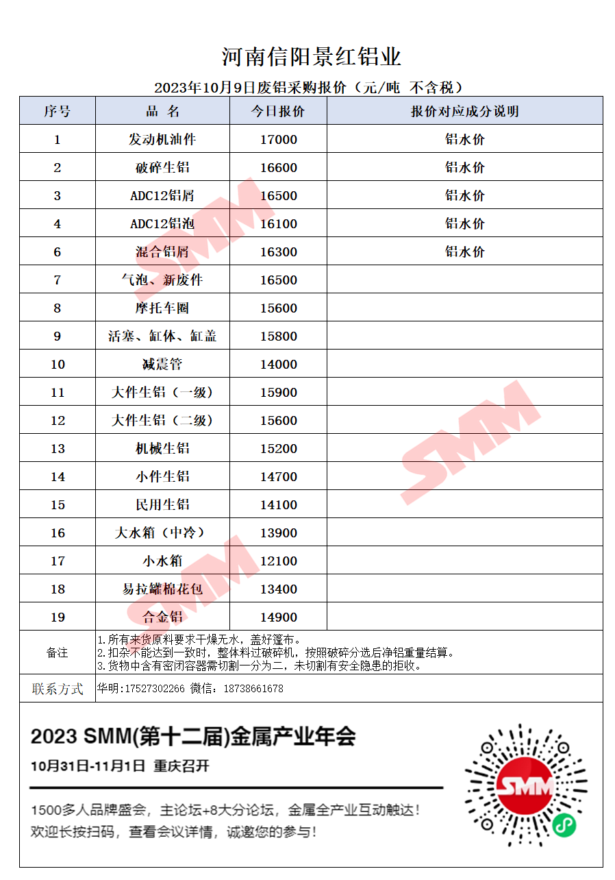 10月9日河南景红 废铝采购报价