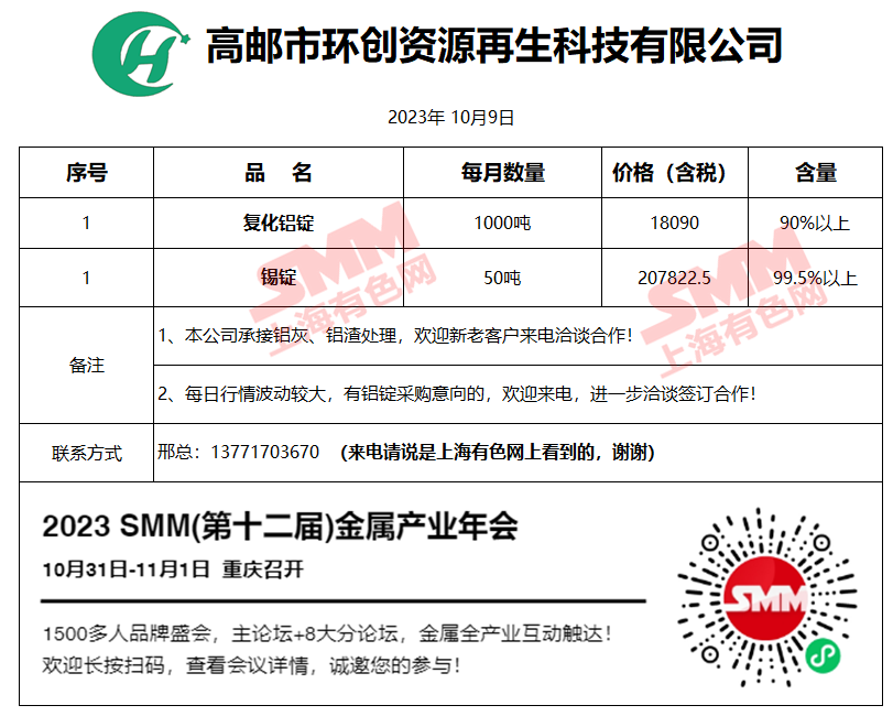今日高邮环创铝业 废铝销售价格已更新,有意向的朋友欢迎联系我们!