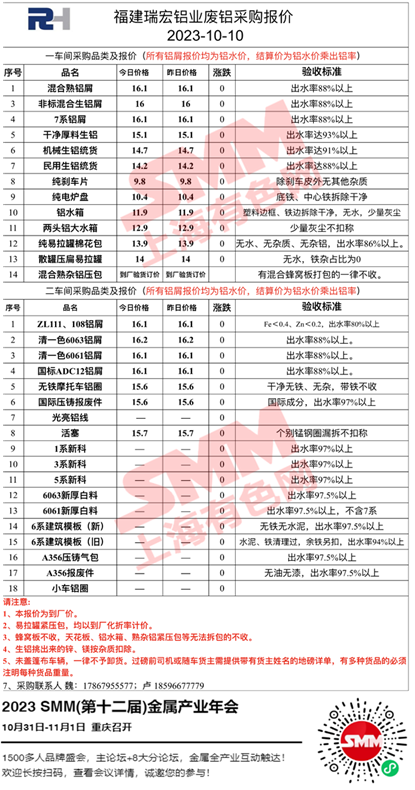10月10日福建瑞宏 废铝采购报价