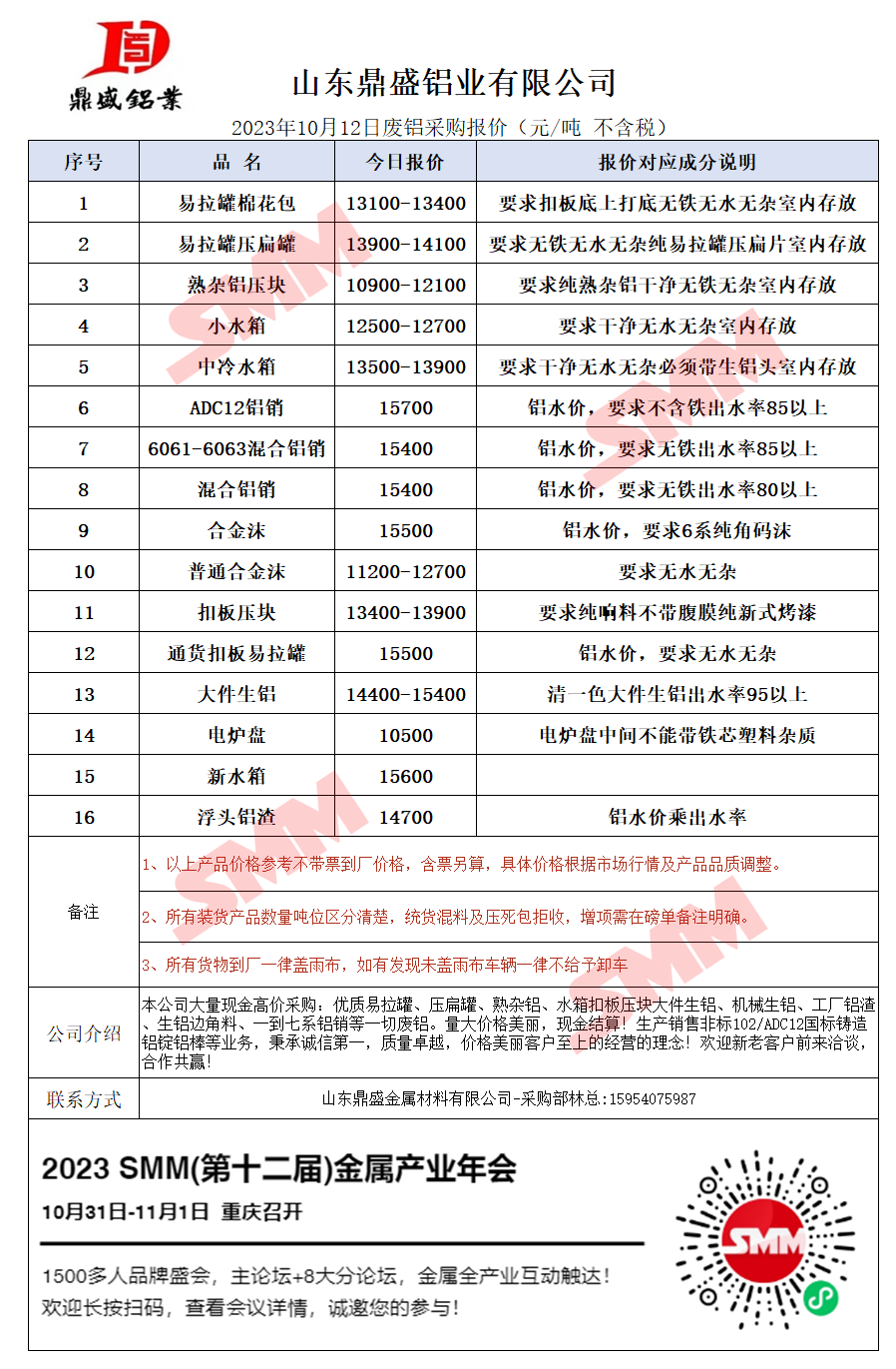 今日山东鼎盛铝业 废铝采购报价已更新,有货的朋友欢迎联系我们!