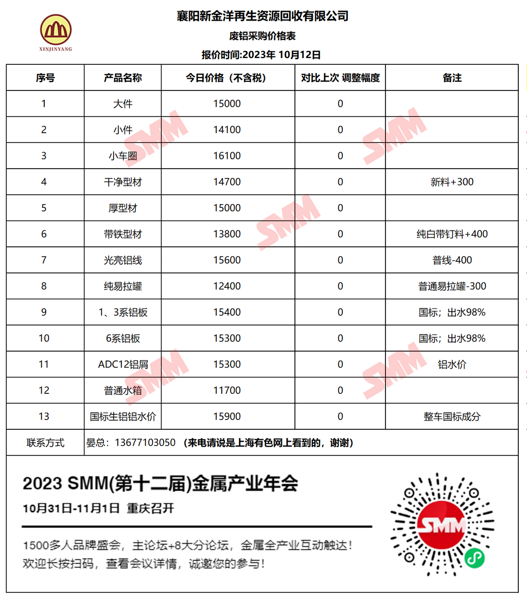 10月12日襄阳新金洋 废铝采购报价