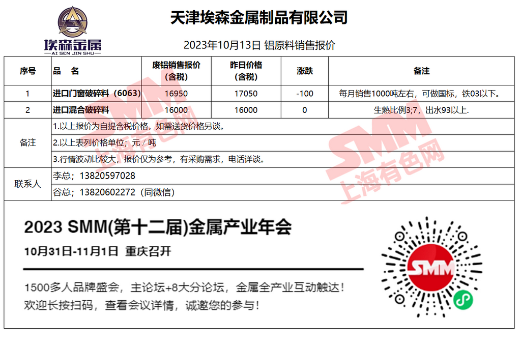 今日天津埃森 废铝销售报价已更新,有采购意向的朋友欢迎联系我们!