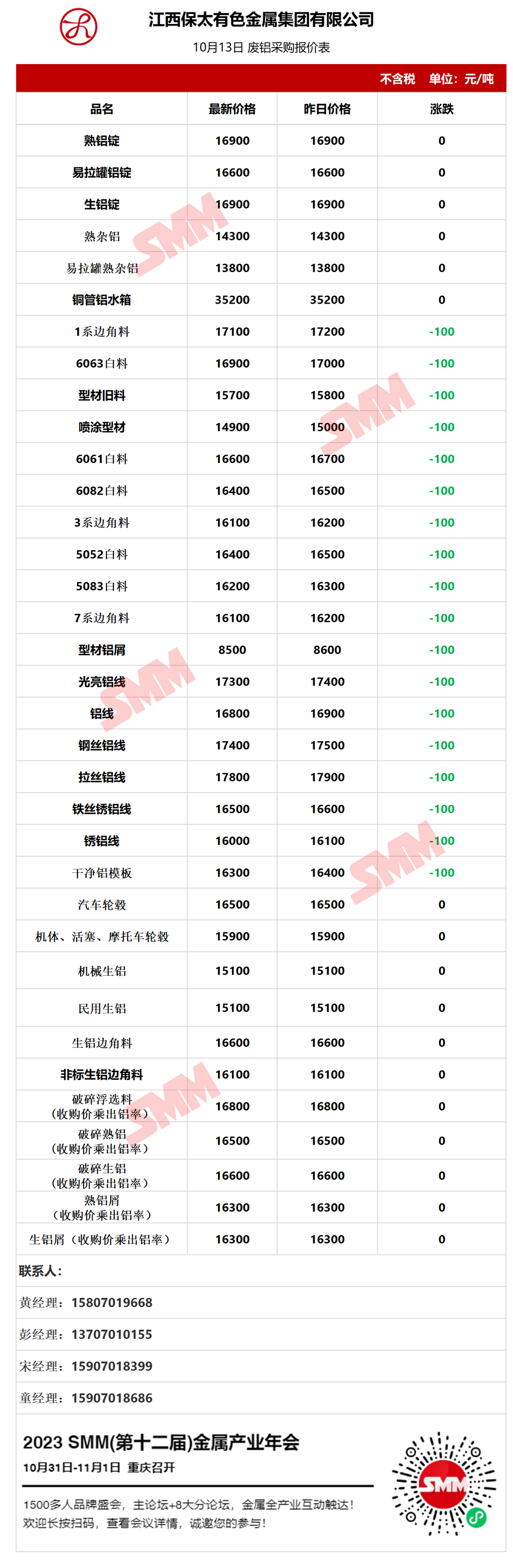 10月13日江西保太 废铝采购报价