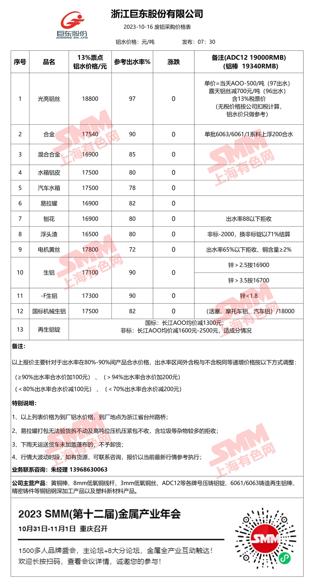 今日浙江巨东 废铝采购报价已更新,有货的朋友欢迎联系我们!
