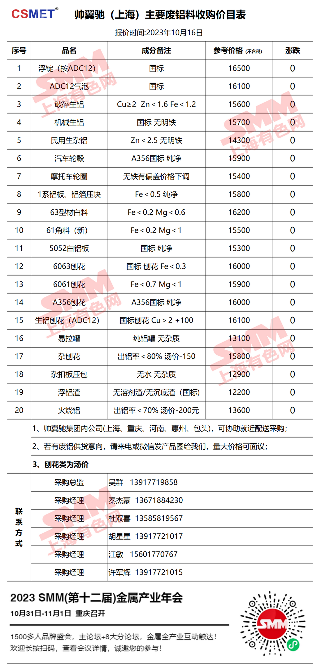 10月16日帅翼驰(上海) 废铝采购报价