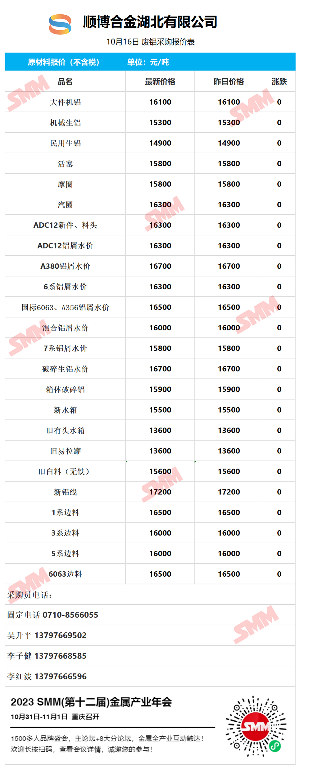 10月16日顺博合金湖北 废铝采购报价